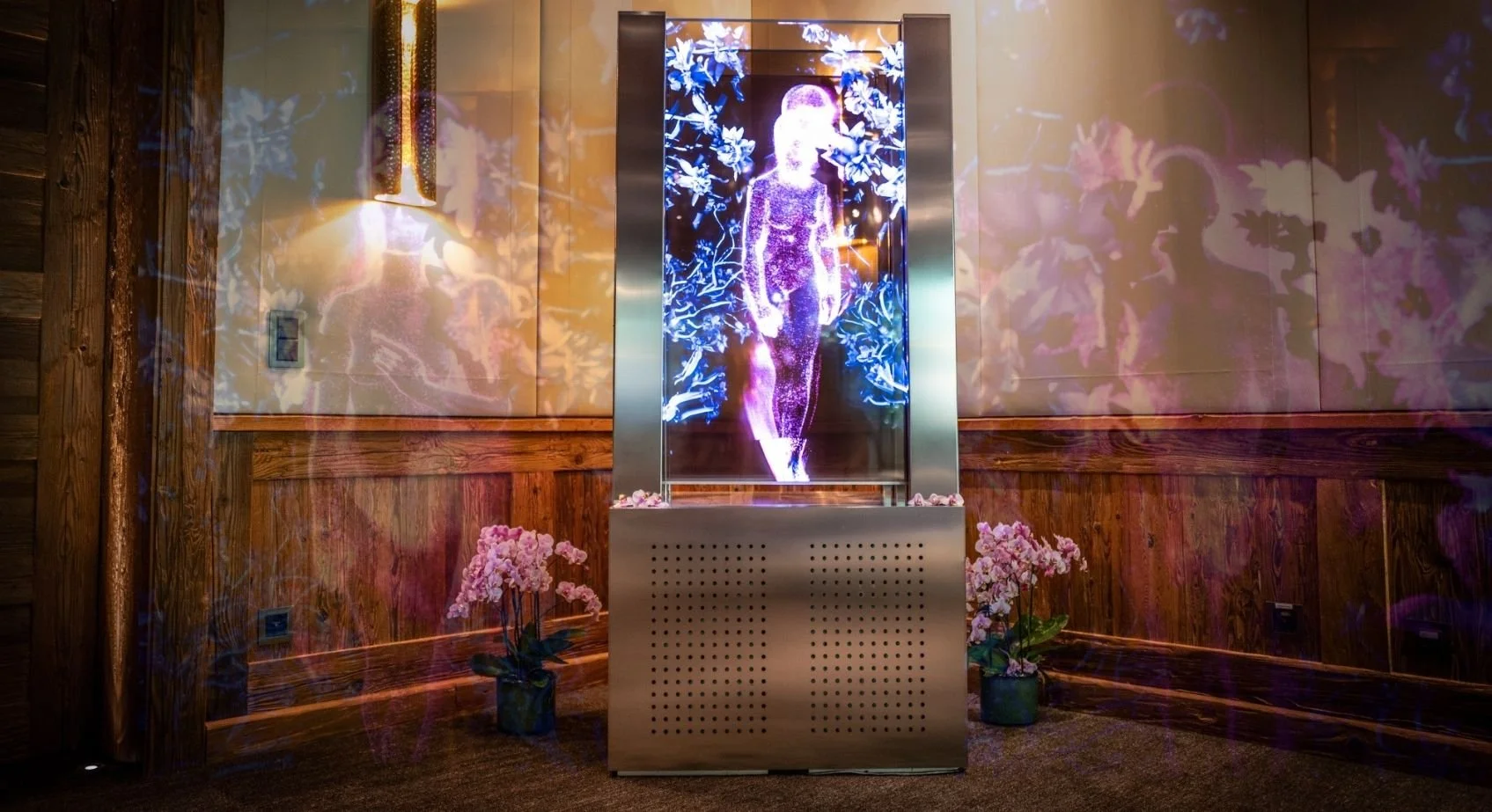 Interactive speech-driven locally deployed custom AI sculpture with Transparent LED Screens and steel. Live dialogue in an immersive sonic environment with real-time visual response and Python-coded voice model and silver talking stick.